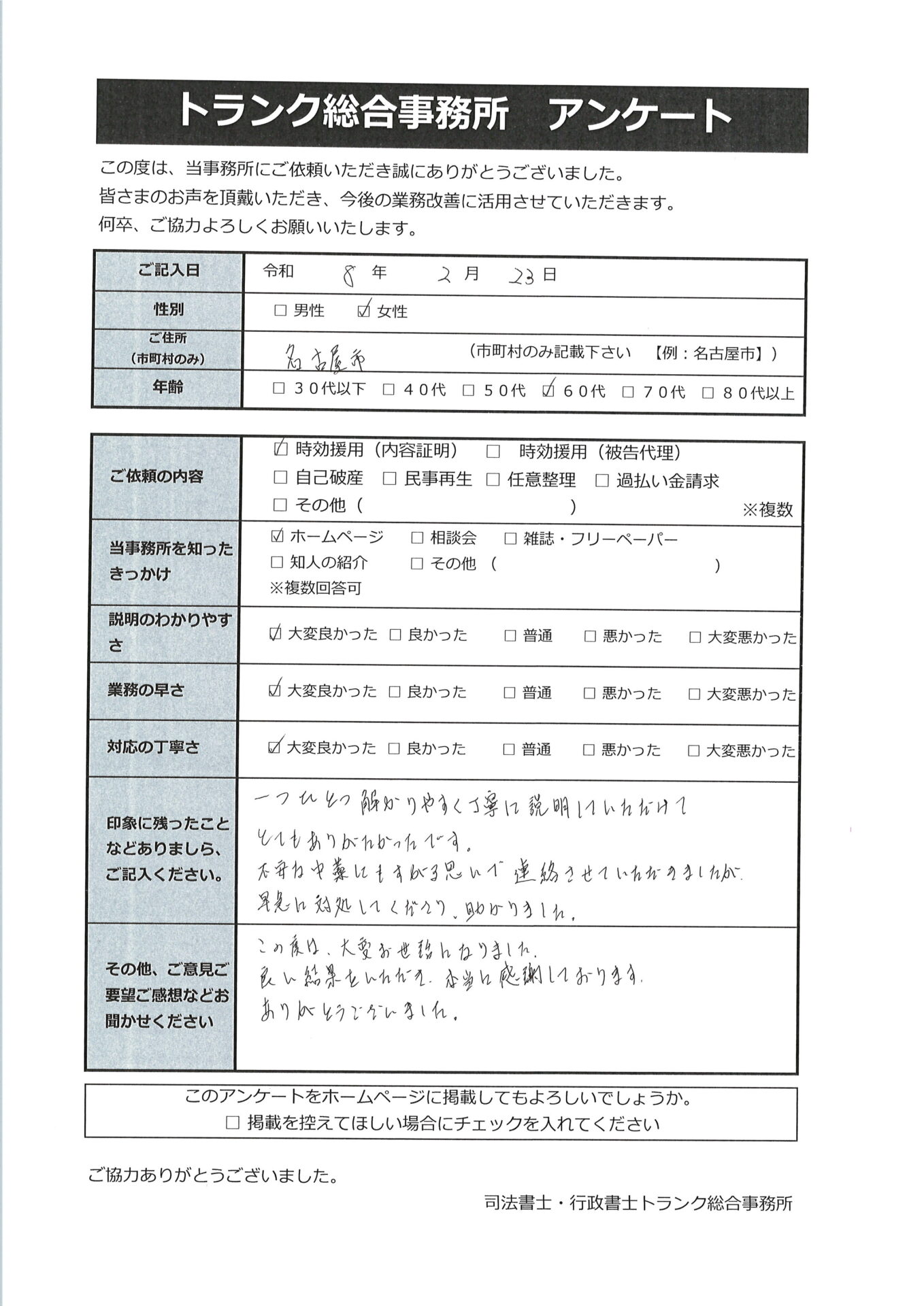 債権者への確認を行わない事務所もありますが、弊所は、少しでもご依頼者様に安心いただけるよう、時効が完成したかを債権者に直接確認し、ご報告させていだきます。また、 契約書の返還や債務不存在証明書の交付等、時効が完成したことのわかる書類も請求し、時効完成が書面でわかるよう対応いたします。 (応じてくれない業者もあります。予めご了承ください。)
